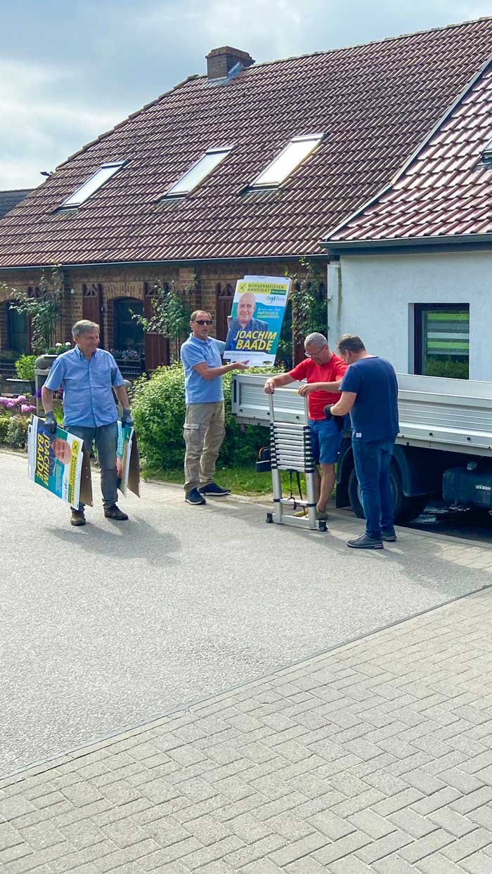 Aber natürlich hat dieser Ausflug einen Grund. Wir wollen den Bürgern zeigen, dass wir da sind. Sechs große Banner gilt es aufzustellen. Etwas ungewohnt ist die Aufgabe. Die großen Gerüste sind ganz schön sperrig und dann die Frage: Wie sichern wir die Banner?